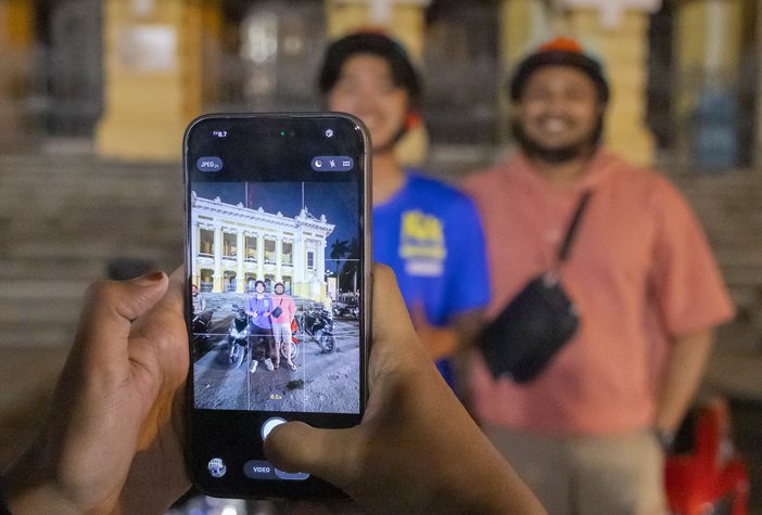 Leaving the narrow streets behind, we cruise along wide tree lined boulevards to catch a view of the tranquilly lit Ho Chi Minh Mausoleum, an imposing marble memorial & the resting place of Vietnam’s most revered leader.