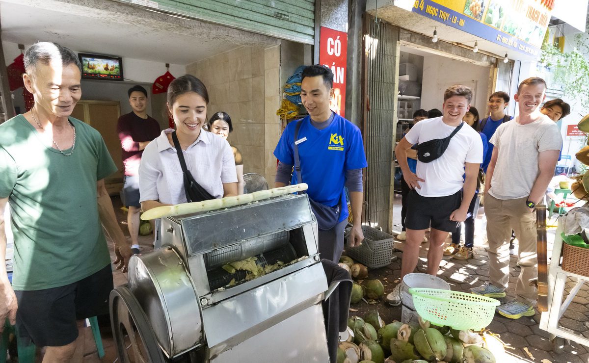 We then explore the lush Banana Gardens on the Red River’s Bãi Giữa Island, an expansive plantation where small boats double as homes for hardworking local families. While there, we fuel up with a refreshing glass of nước mía (a sugarcane juice drink)